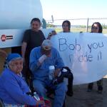 A smiling Bob at the airport, with others congratulating him for his accomplishment.